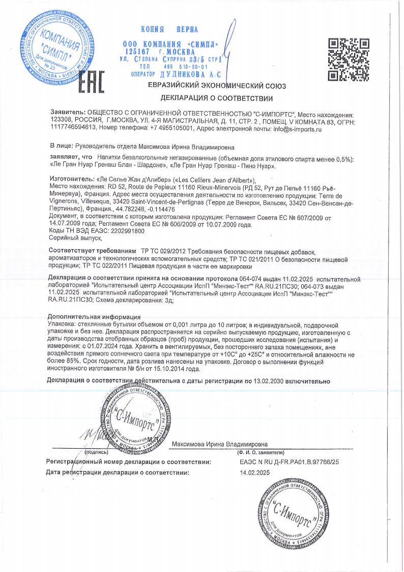 Красное безалкогольное вино Le Grand Noir Grenache-Pinot Noir — элегантный дуэт, рожденный под солнцем Лангедока.