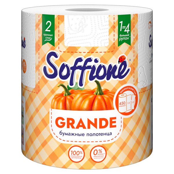 Полотенца Soffione Grande бумажные - удобный и выгодный формат. Благодаря тому, что Grande изготовлен из 100% целлюлозы, обеспечивается безопасный контакт с пищевыми продуктами. Большого рулона хватает надолго из-за того, что изделие экономно расходуется. Оно способно устранять мелкие загрязнения, разводы и пятна, натирать до блеска ровные поверхности на кухне, в спальне, ванной комнате. Полотенца состоят из двух слое, поэтому эффективно впитывают влагу. Приятный на ощупь материал характеризуется экологичностью.