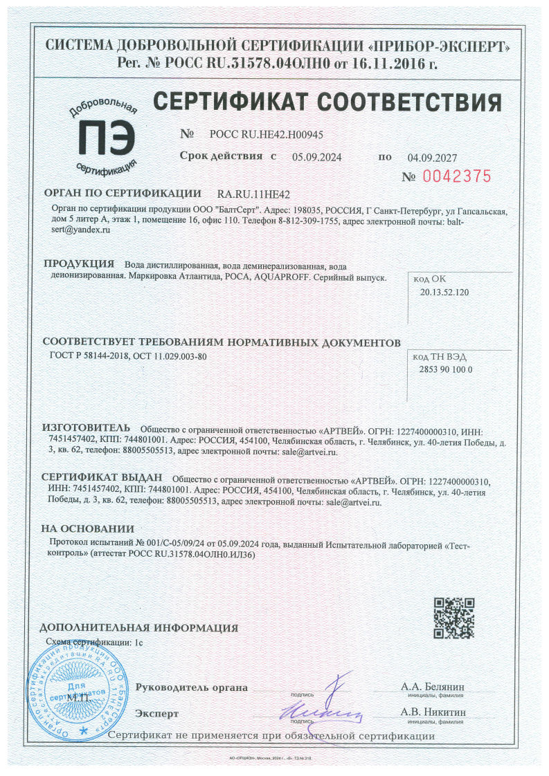 Состав: дистиллированная вода 100%