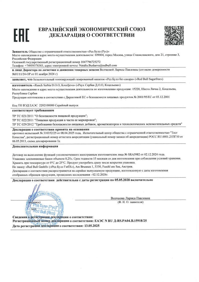•Энергетические напитки Red Bull содержат ингредиенты высокого качества: кофеин, таурин, витамины B, сукралозу и ацесульфам К.