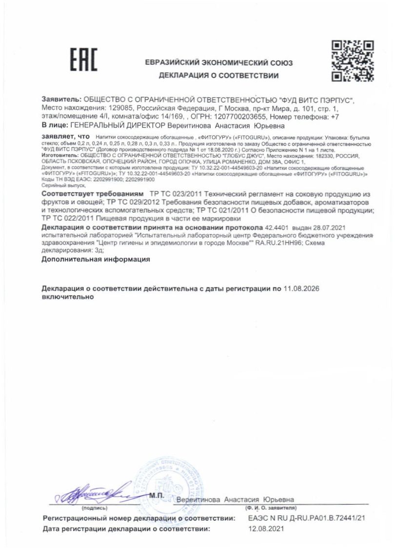При регулярном употреблении повышает остроту зрения; улучшает цвето- и световосприятие; помогает бороться с преждевременным разрушением сетчатки глаза. Функциональные напитки Fitoguru восполняют дефицит рациона питания , укрепляют ваше здоровье благодаря четко выверенной суточной дозы биологически активных веществ от самой природы. Минимальная доля сока 92%. Не содержит добавленного сахара и сахарозаменителей, красителей, консервантов, искуственных ароматизаторов и красителей, ГМО