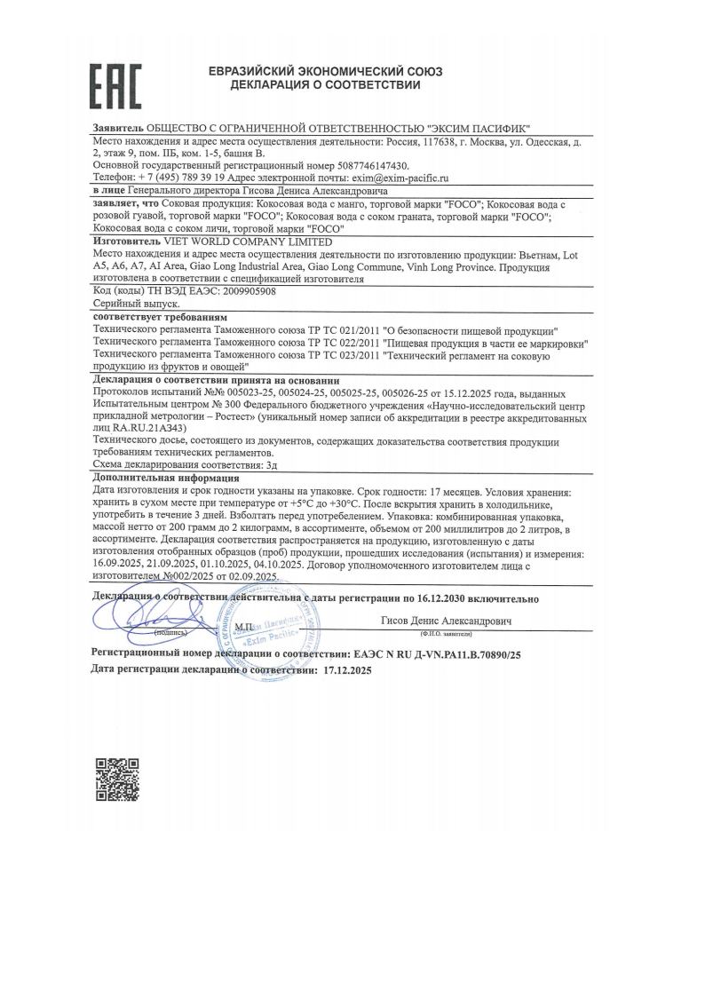 Кокосовая вода с соком граната Foco 0.33 литра, без газа, тетра-пак, 12 шт. в уп.