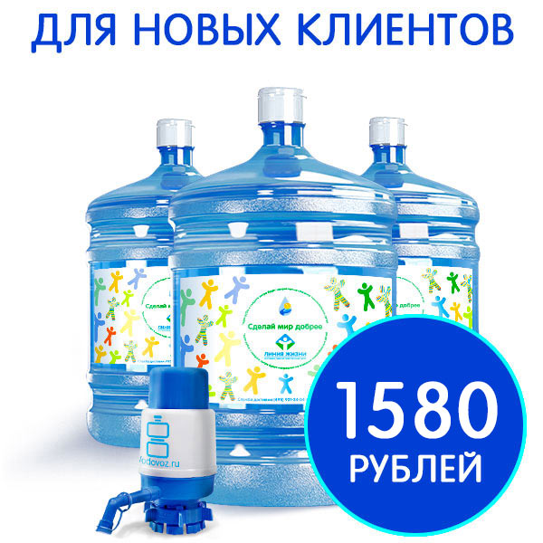 Комплект из 3 баллонов воды «Сделай Мир Добрее» 19 литров и помпа с бесплатной доставкой всего за 1580 рублей для новых клиентов.