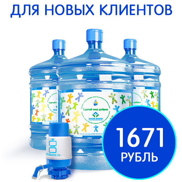 Комплект из 3 баллонов воды «Сделай Мир Добрее» 19 литров и помпа с бесплатной доставкой всего за 1671 рублей для новых клиентов.