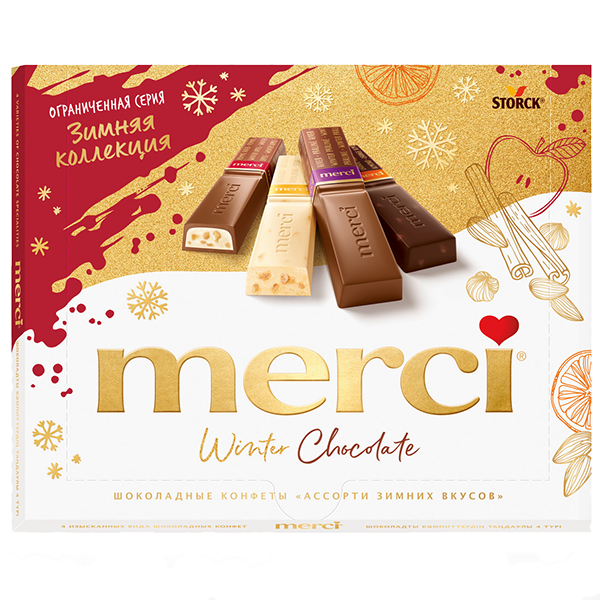 Набор шоколадных конфет Merci Ассорти зимних вкусов 250 гр купить с доставкой по Москве и МО. Заказать на дом или в офис можно через сайт, мобильное приложение Vodovoz.ru или по телефону. Принимаем заказы 24/7. Доставка осуществляется в удобное для Вас время.