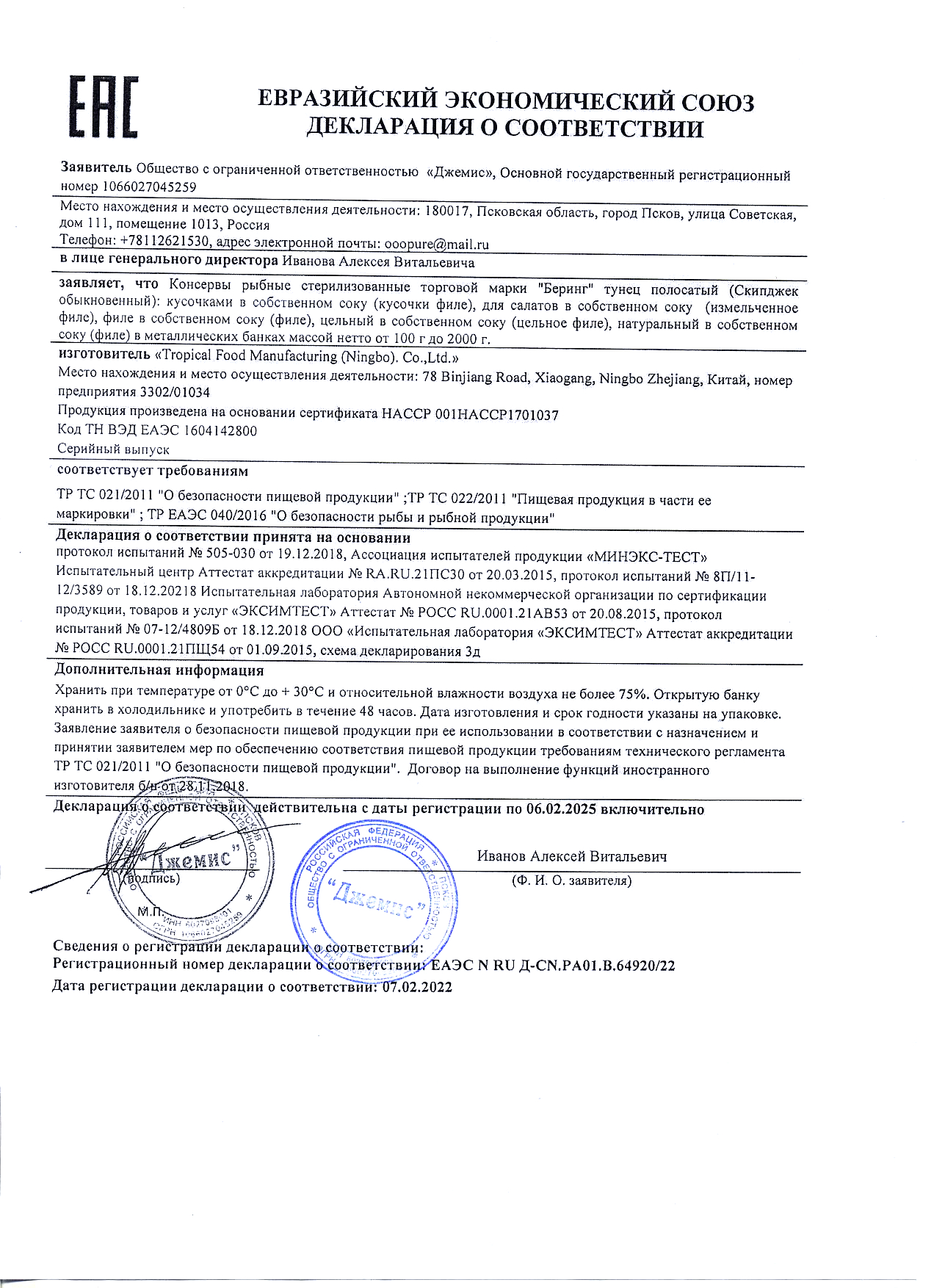 "Tropical Food Manufacturing (Ningbo). Co.,Ltd." |