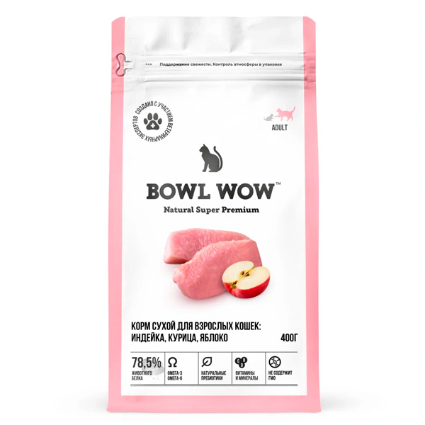 Корм сухой Bowl Wow для взрослых кошек индейка, яблоко 400 гр