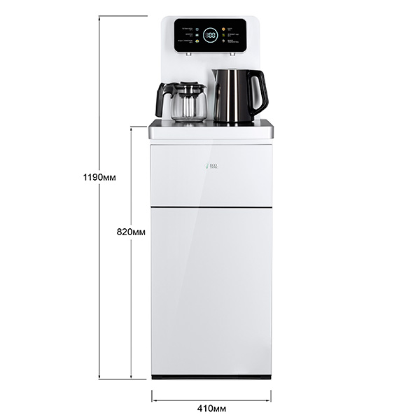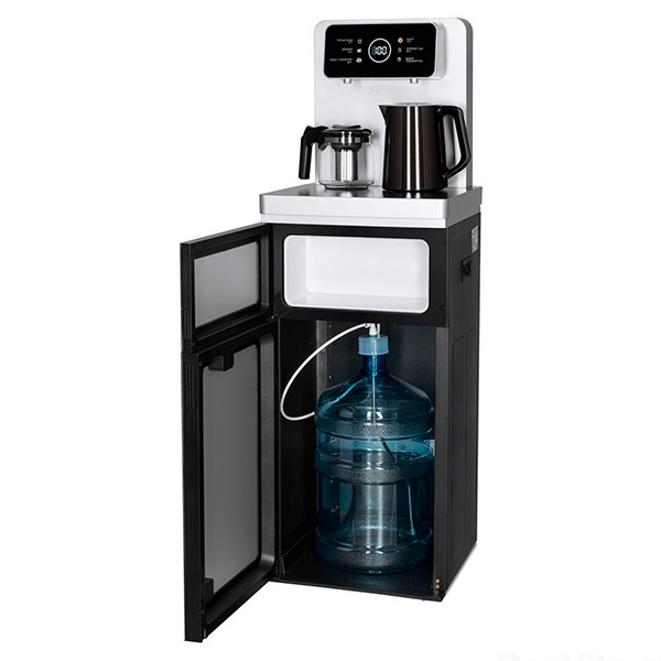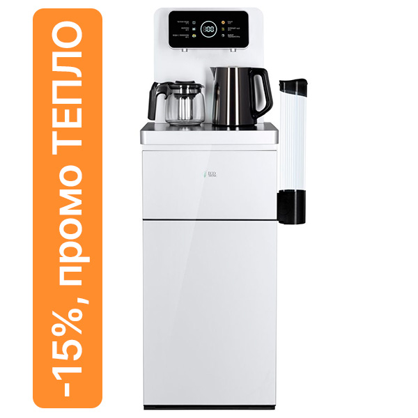 Большая и удобная панель управления с возможностью задать температуру нагрева (5 режимов нагрева). Пульт дистанционного управления. Нижняя загрузка бутыли. Два чайника — для кипячения ( 1 л.) и заварочный ( 1 л.). Без охлаждения, только нагрев и подача воды комнатной температуры. Нагрев воды в чайнике до 100°С. Шкафчик для хранения.