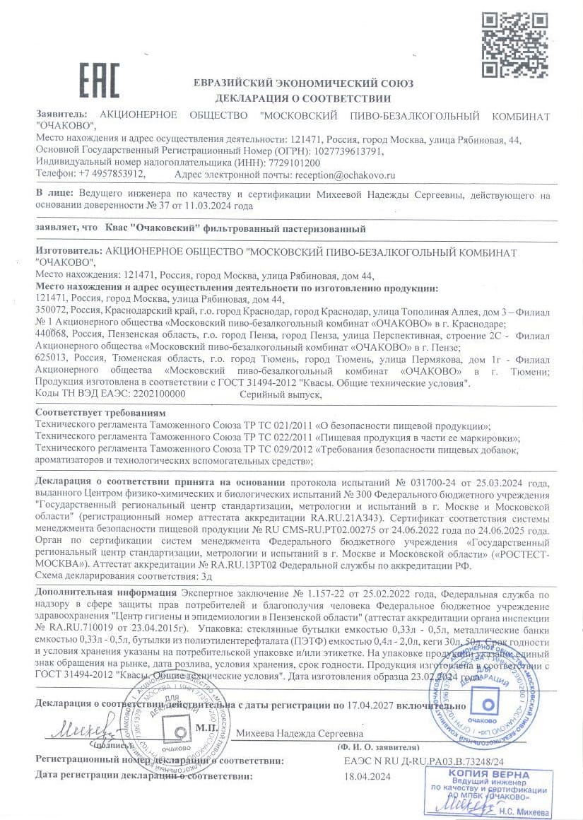 АО «МОСКОВСКИЙ ПИВО-БЕЗАЛКОГОЛЬНЫЙ КОМБИНАТ «ОЧАКОВО» |