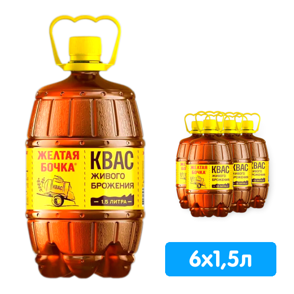 Квас Желтая Бочка 1,5 литра, пэт, 6 шт. в уп.
