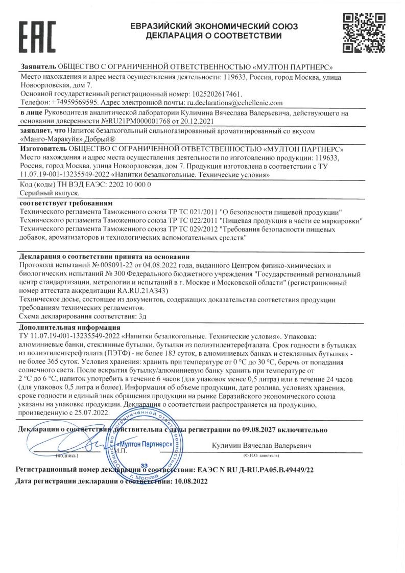 Напиток Добрый Манго-Маракуйя 0.33 литра, газ, ж/б, 12 шт. в уп. купить с доставкой по Москве и МО. Заказать на дом или в офис можно через сайт, мобильное приложение Vodovoz.ru или по телефону. Принимаем заказы 24/7. Доставка осуществляется в удобное для Вас время.