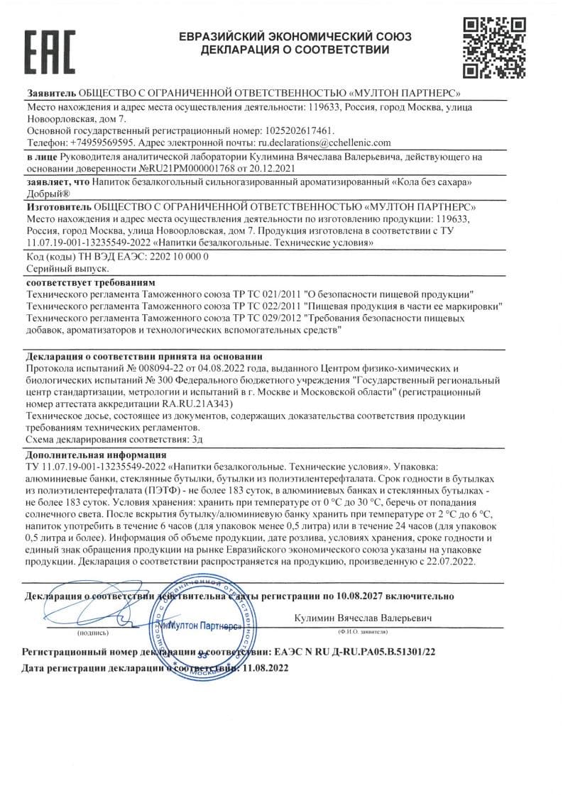 Новый сильногазированный напиток «Добрый» Кола без сахара - яркий вкус без калорий. Освежающий заряд хорошего настроения, которым так хочется делиться с тем, кто рядом! Пейте охлажденным!
