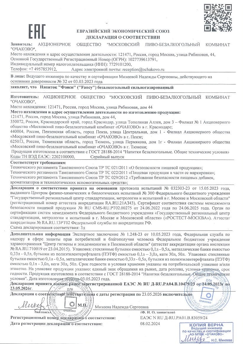АО «МОСКОВСКИЙ ПИВО-БЕЗАЛКОГОЛЬНЫЙ КОМБИНАТ «ОЧАКОВО» |
