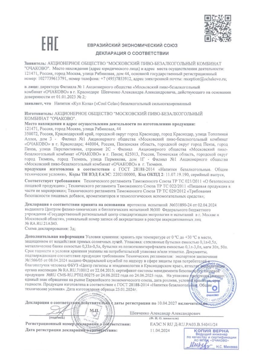 АО «МОСКОВСКИЙ ПИВО-БЕЗАЛКОГОЛЬНЫЙ КОМБИНАТ «ОЧАКОВО» |