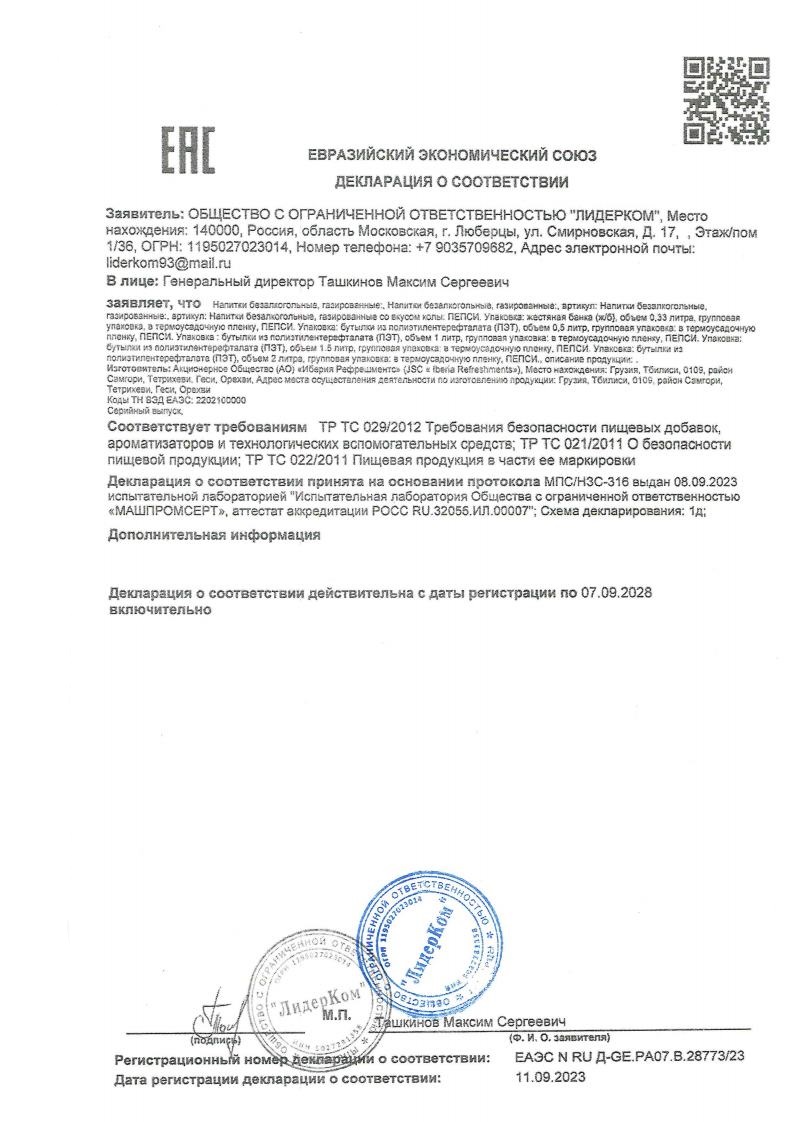 Сильногазированный безалкогольный напиток на ароматизаторах "Пепси- кола". Пейте охлажденным. Состав: очищенная питьевая вода, сахар, двуокись углерода, кофеин, натуральный ароматизатор "Кола", натуральные экстракты. Энергетическая ценность: 50,7 ккал. Хранить в сухом, прохладном месте при Т от 0 до 35'C. Срок годности 12 месяцев.