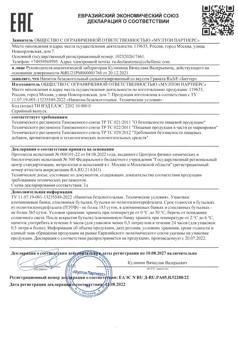 Напиток сокосодержащий Rich Биттер Гранат 0.33 литра, газ, ж/б, 12 шт. в уп. купить с доставкой по Москве и МО. Заказать на дом или в офис можно через сайт, мобильное приложение Vodovoz.ru или по телефону. Принимаем заказы 24/7. Доставка осуществляется в удобное для Вас время.