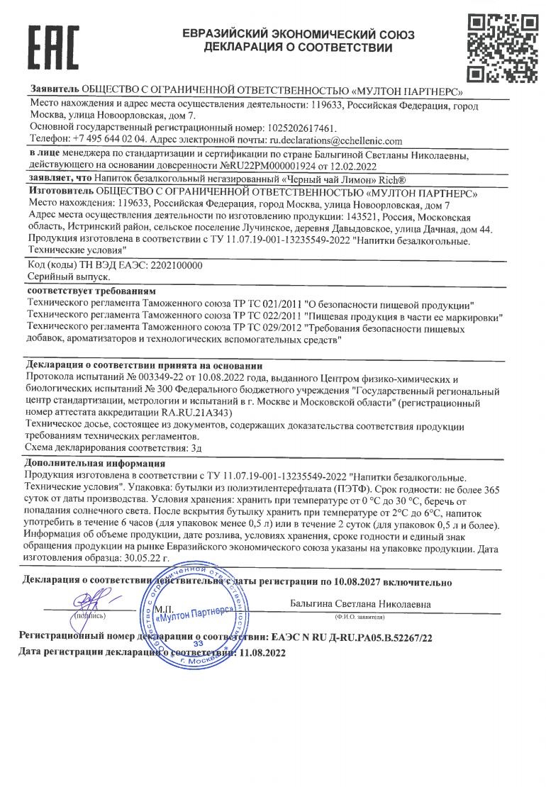 Очищенная вода, сахар, лимонный сок, экстракт черного чая, регуляторы кислотности (лимонная кислота, цитрат натрия 3-замещенный), натуральные ароматизаторы, краситель сахарный колер IV.