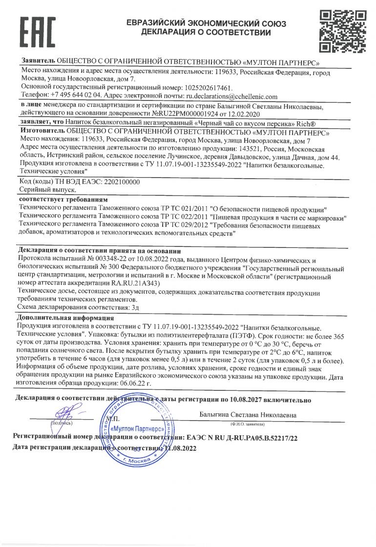 Напиток Rich черный чай персик 1 литр, пэт, 12 шт. в уп.