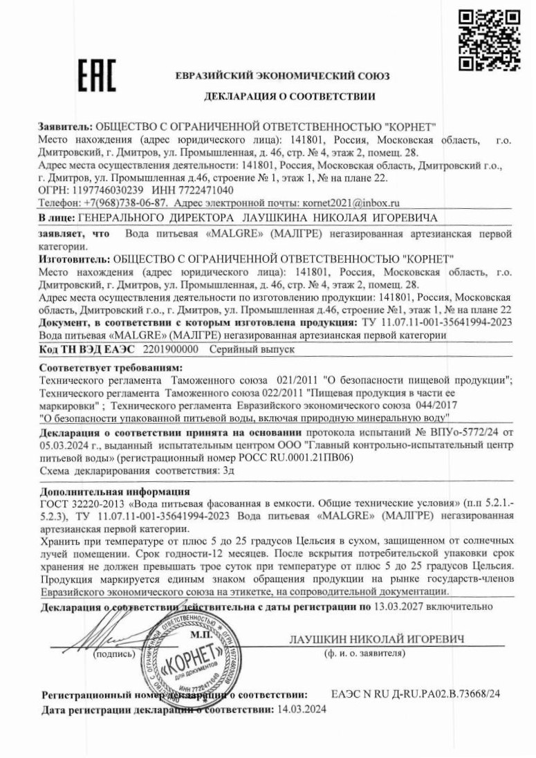 Вода MALGRE - aртезианская, озонированная вода богата магнием, кальцием и натрием, обладает повышенной мягкостью и приятной свежестью. Вода добывается из природного источника, проходя через многоступенчатую систему естественных и технологических фильтров, благодаря чему достигается кристальная чистота.
