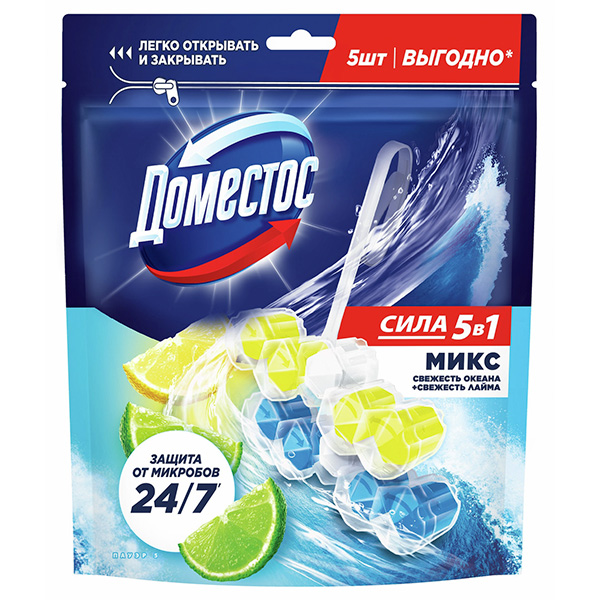 Средство для чистки унитаза Доместос Power 5 MIX Свежесть лайма и свежесть океана 5 х 50 гр купить с бесплатной доставкой по Москве и МО. Заказать на дом или в офис можно через сайт, мобильное приложение Vodovoz.ru или по телефону. Принимаем заказы 24/7. Доставка осуществляется в удобное для Вас время.