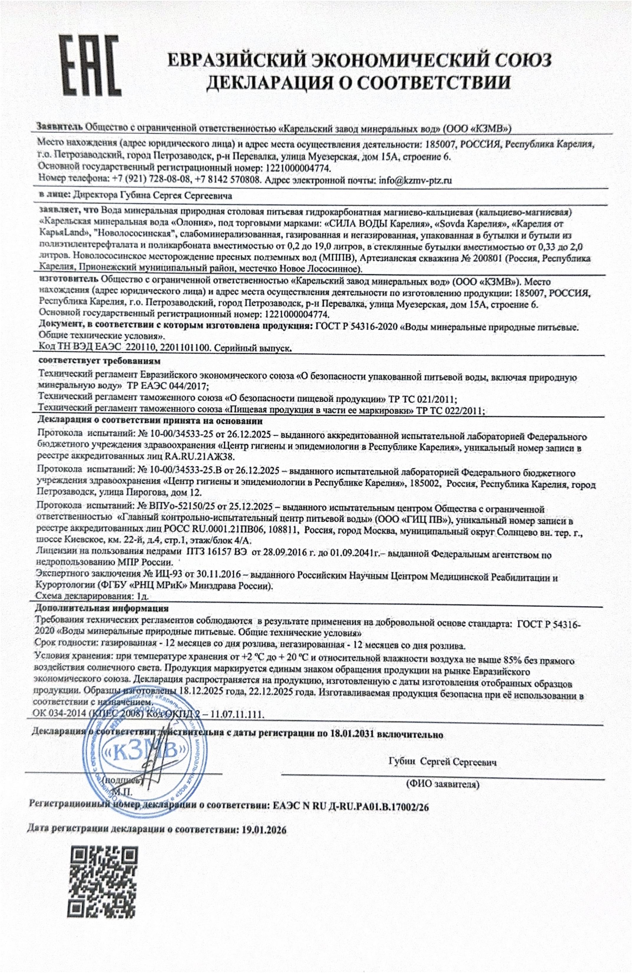 По результатам лабораторных исследований, питьевая вода «СИЛА ВОДЫ Карелия» прошла проверку на соответствие требованиям качества и безопасности пищевой продукции.