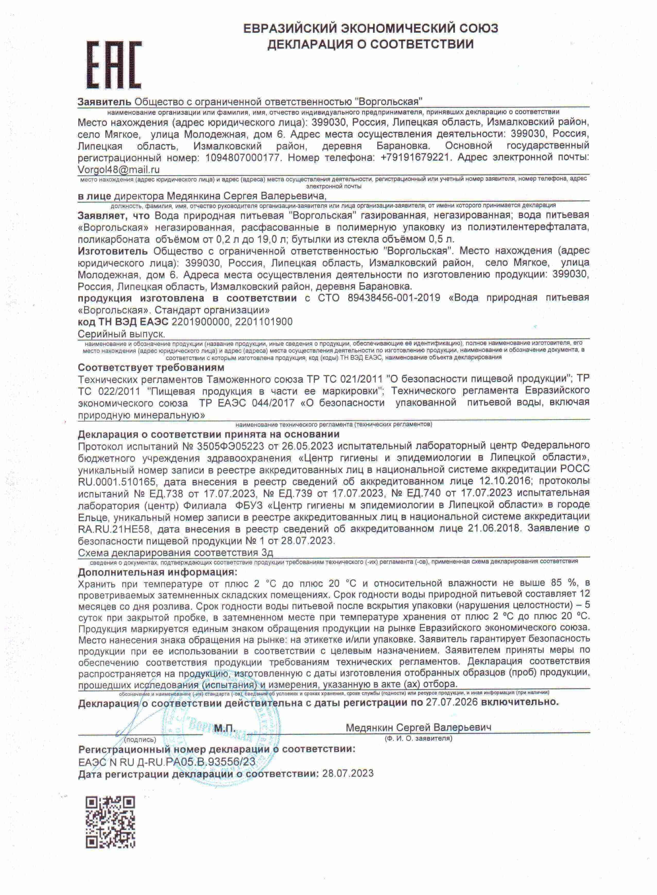 По результатам лабораторных исследований, питьевая вода Vorgol прошла проверку на соответствие требованиям качества и безопасности пищевой продукции.