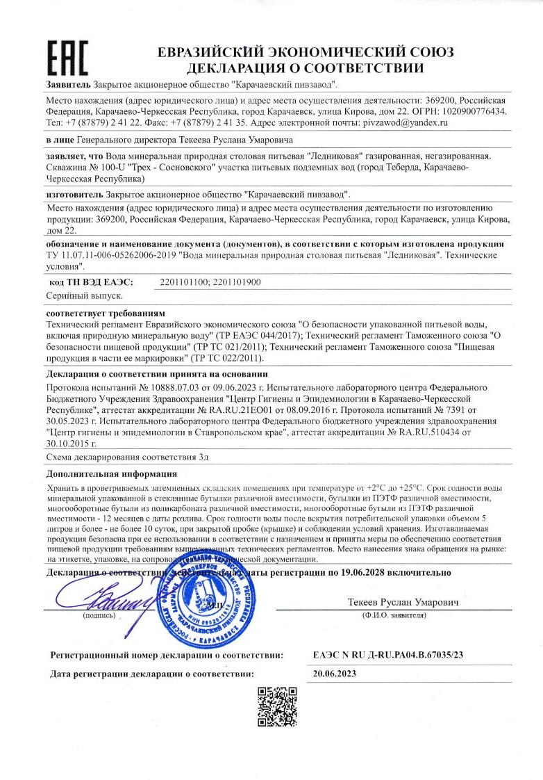 Производство природной столовой воды «Ледниковая» организовано с учетом всех требований органов санэпиднадзора и проходит регулярный контроль в российских органах сертификации и стандартизации.