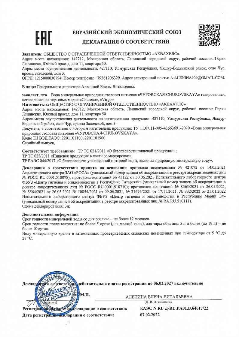Природная питьевая щелочная вода VIRGO fons. добывается в прекрасной местности в Удмурской республики, Якшур-Бодьинском районе, не имеет противопоказаний, ее рекомендуется употреблять в качестве питьевой воды. Обычная суточная норма: 0,5-1,5 литра.
