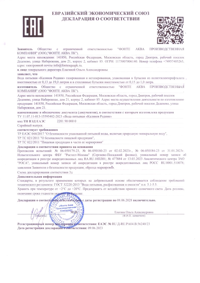 По результатам лабораторных исследований, питьевая вода «Калинов Родник» прошла проверку на соответствие требованиям качества и безопасности пищевой продукции.