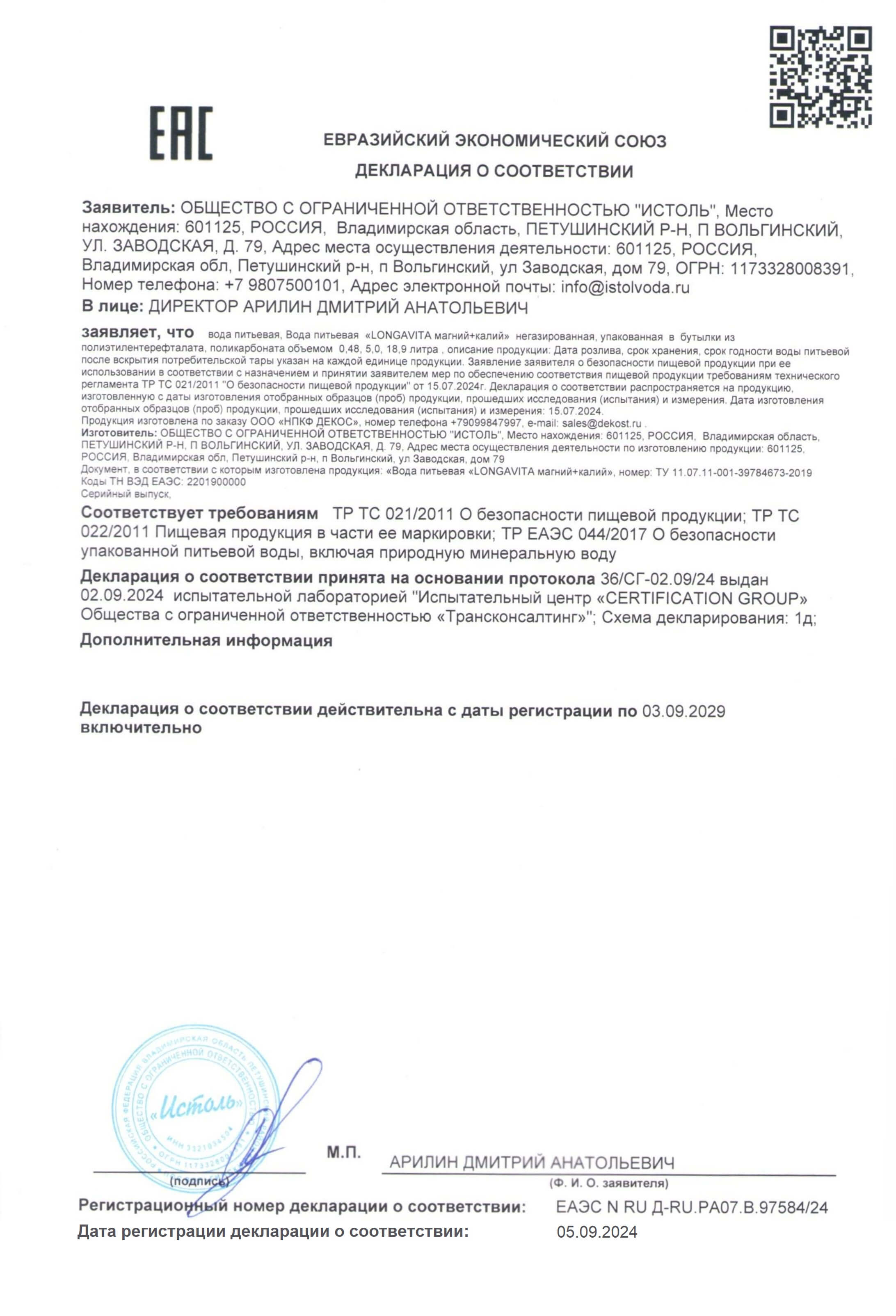 По результатам лабораторных исследований, питьевая вода «Longavita магний + калий» прошла проверку на соответствие требованиям качества и безопасности пищевой продукции. Она проходит уникальную водоподготовку, включающую в себя 14 ступеней. Разливается в одноразовую ПЭТ-тару, соответствующую всем современным нормам безопасности пищевой промышленности и не содержащую Бисфенол-А (маркировка BPA Free).