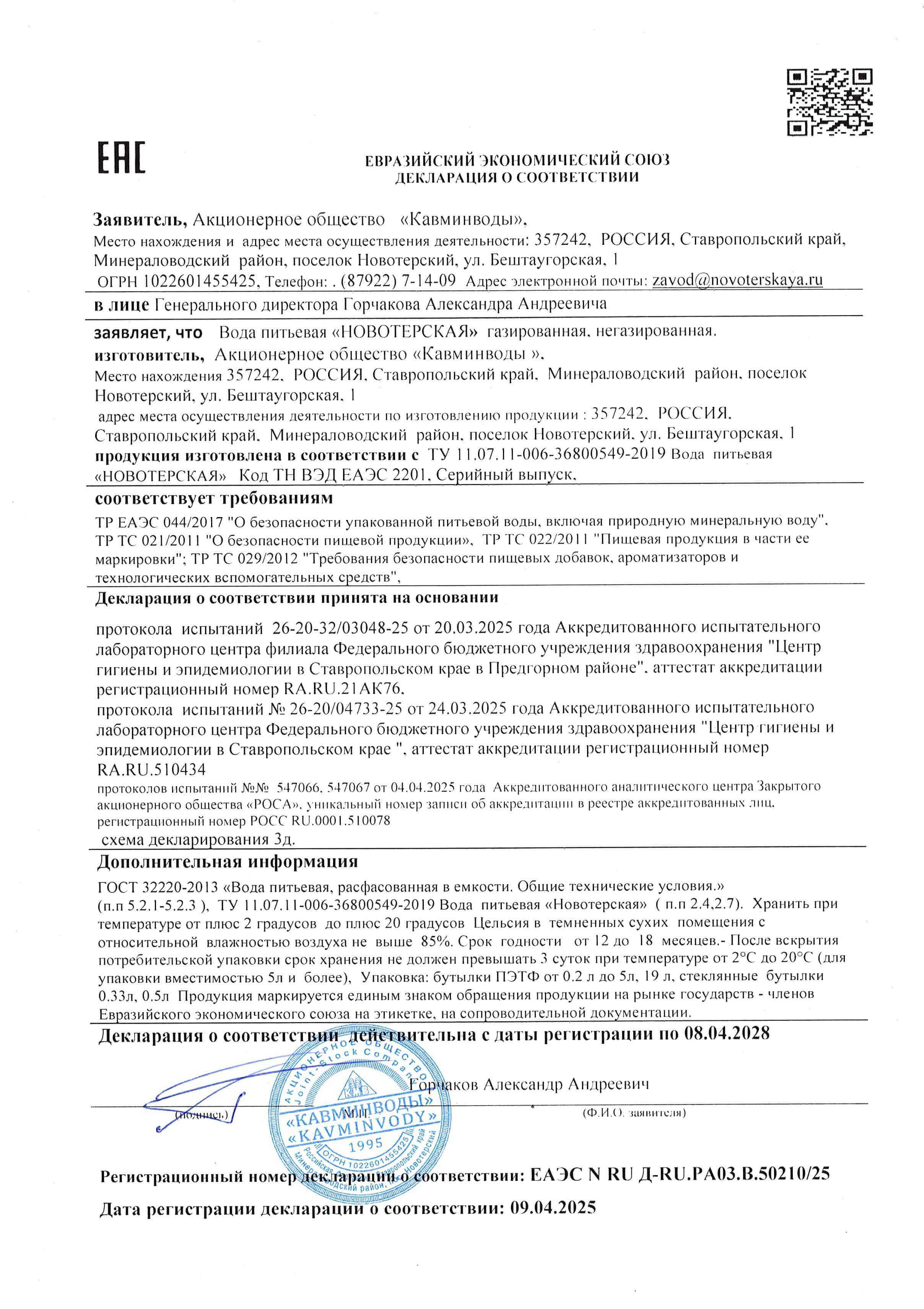 По результатам лабораторных исследований, питьевая вода «Новотерская» прошла проверку на соответствие требованиям качества и безопасности пищевой продукции.