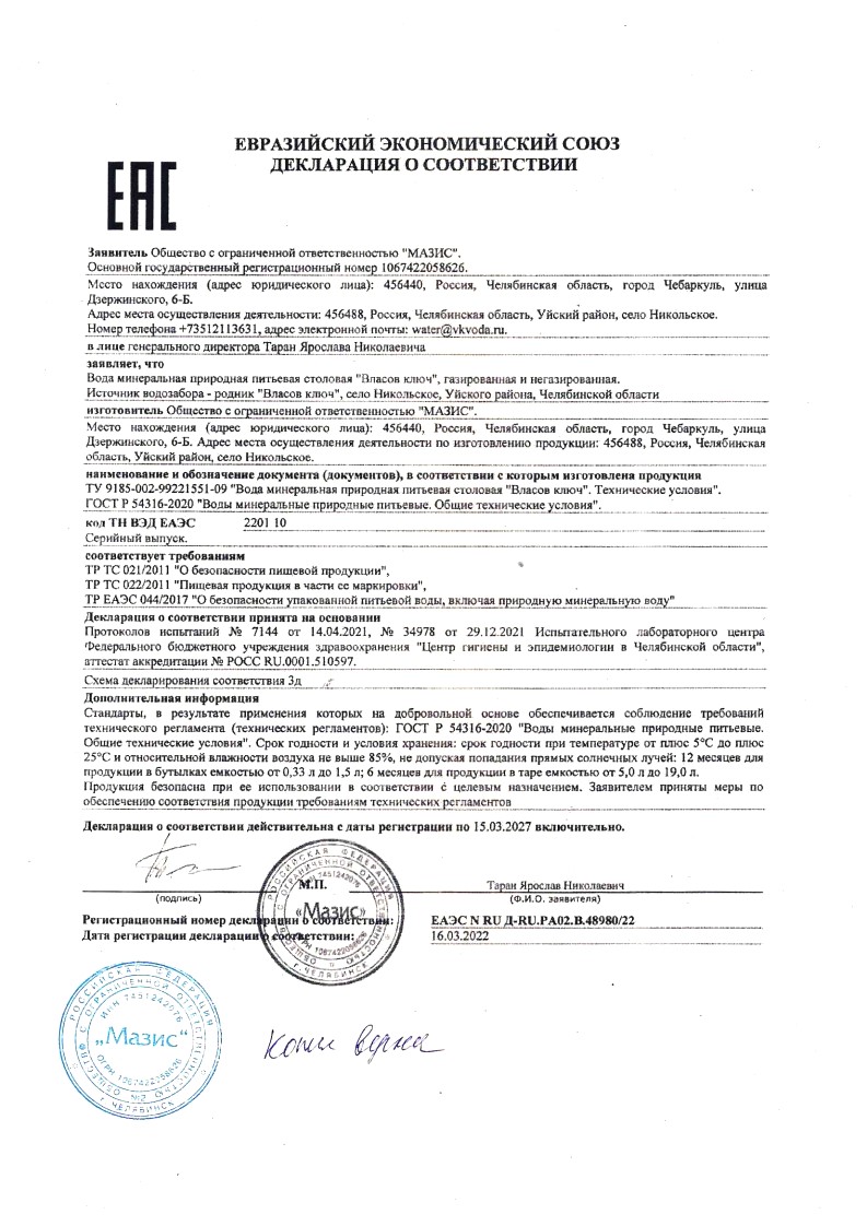 По результатам лабораторных исследований, природная питьевая вода «Власов ключ» прошла проверку на соответствие требованиям качества и безопасности пищевой продукции.
