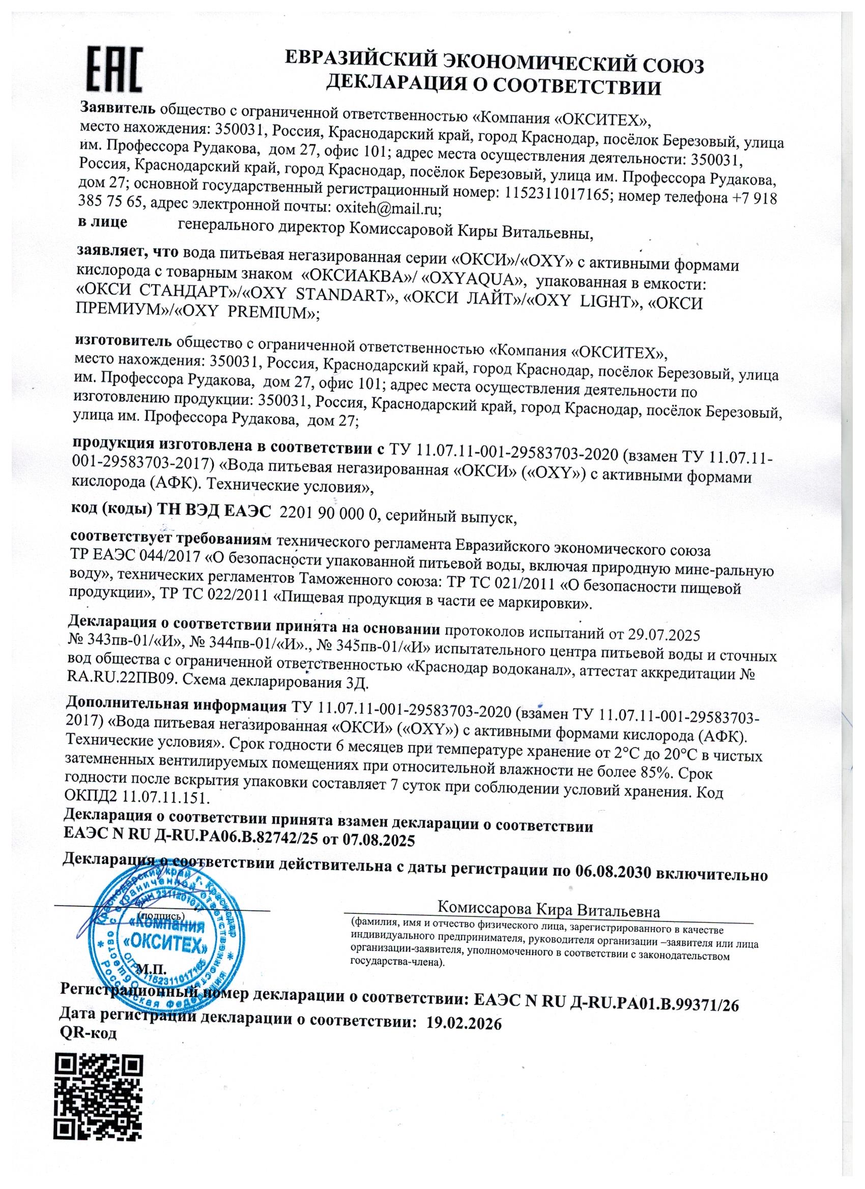 По результатам лабораторных исследований, питьевая вода OxyAqua ПРЕМИУМ прошла проверку на соответствие требованиям качества и безопасности пищевой продукции.