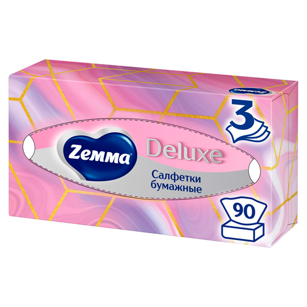 Салфетки косметические Zemma Deluxe 3-х сл. 90шт (1шт) купить с бесплатной доставкой по Москве и МО. Заказать на дом или в офис можно через сайт, мобильное приложение Vodovoz.ru или по телефону. Принимаем заказы 24/7. Доставка осуществляется в удобное для Вас время.