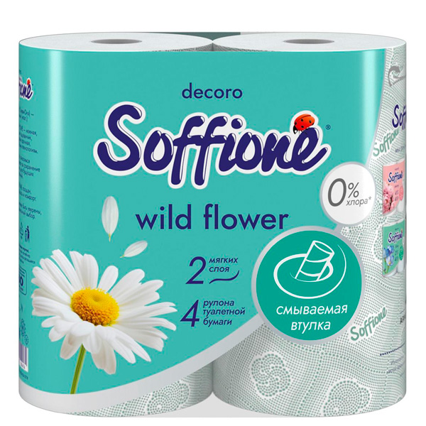 Туалетная бумага Soffione Decoro Ромашка 2х-слойная (4 шт) купить с бесплатной доставкой по Москве и МО. Заказать на дом или в офис можно через сайт, мобильное приложение Vodovoz.ru или по телефону. Принимаем заказы 24/7. Доставка осуществляется в удобное для Вас время.