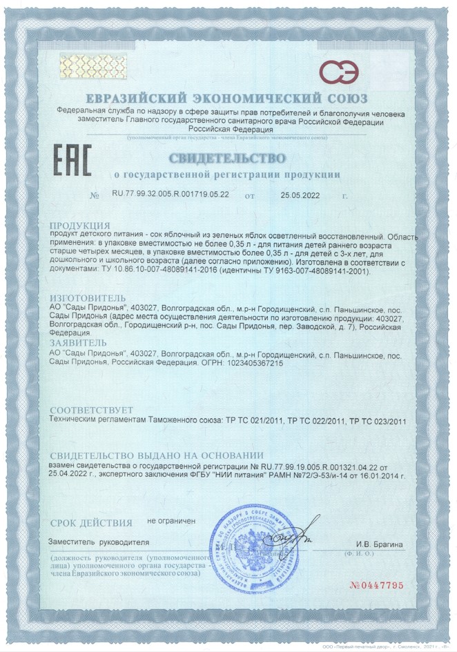 Производится из яблок сортов Синап Северный, Курский Золотой, Избранница. Гипоаллергенный, без сахара. Богат витамином С. Подходит для питания детей с трех месяцев. Пищевая ценность в 100 г: углеводы — 11,5 г, энергетическая ценность — 46 ккал. Стерилизован и асептически расфасован.