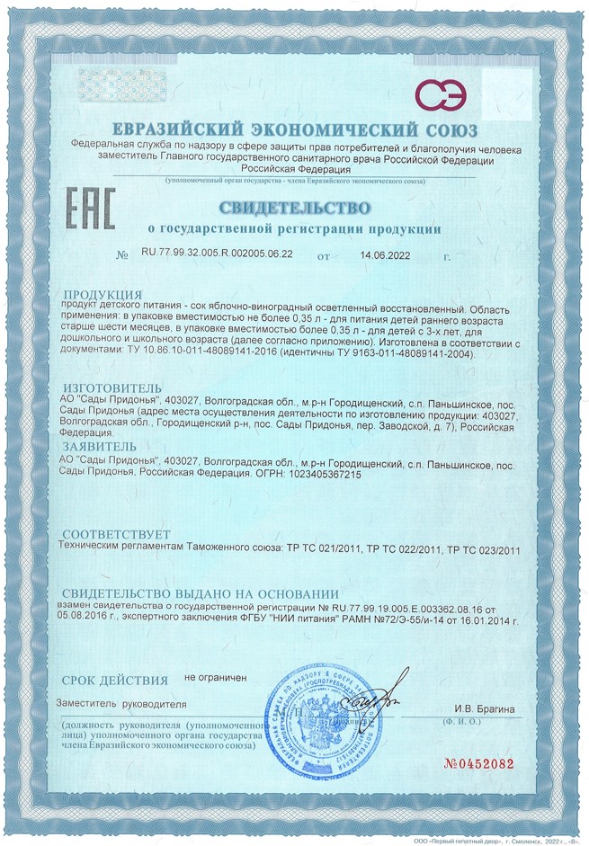 Производится из концентрированных соков зеленого яблока и белого винограда. Осветленный, без сахара. Подходит для питания детей от шести месяцев. Пищевая ценность в 100 г: углеводы — 11,5 г, энергетическая ценность — 46 ккал. Стерилизован и асептически расфасован.