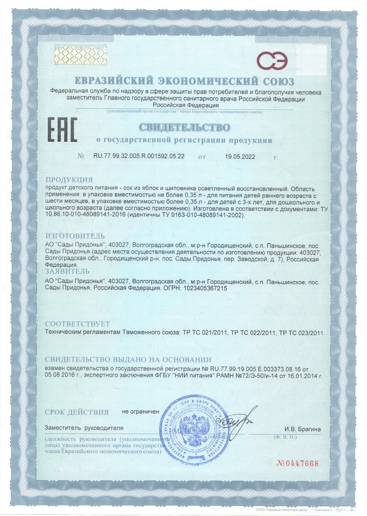 Производится из концентрированных соков шиповника и зеленого яблока. Осветленный, без сахара. Богат витамином С, каротином, железом и пищевыми волокнами. Подходит для питания детей с шести месяцев. Пищевая ценность в 100 г: углеводы — 11,5 г, энергетическая ценность — 46 ккал. Стерилизован и асептически расфасован.