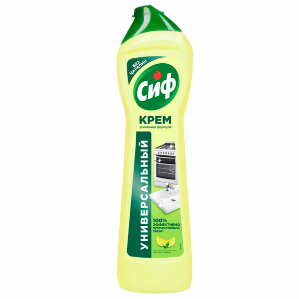 Чистящее средство "Сиф Актив Лимон" со специальными микрогранулами- эксперт в области эффективного очищения с заботой о поверхности. Мощная формула густого крема "Сиф" справится даже пригоревшим жиром, известковым налетом и самыми стойкими загрязнениями на кухне, в ванной и по всему дома. Упаковка: пластиковая бутылка с зеленой крышкой.