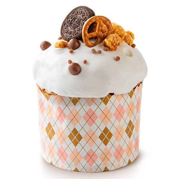 Крупный пасхальный кулич из сдобного дрожжевого теста, с центром из начинки соленой карамели. Украшен сладкой сахарной помадкой, попкорном и крендельками.