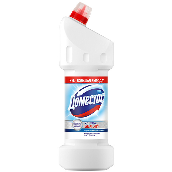 Инновационный’ семиструйный дозатор обеспечивает максимальную зону поражения микробов благодаря носику, который до 3 раз эффективнее в труднодоступных местах и под ободком унитаза’’. Благодаря особой формуле с дезинфицирующим эффектом и чистящими компонентами Доместос "Ультра белый" не только очищает'’’ , но и превосходно отбеливает фаянсовые поверхности. Ваша сантехника засияет белоснежной чистотой. Кроме того, Доместос «Ультра Белый» экономичен – благодаря густой гелевой текстуре он расходуется намного дольше, чем обычные жидкие средства. «Ультра белый» многофункционален: он подходит не только для чистоты и гигиены унитаза, но и для удаления плесени, мыльного осадка, антимикробной обработки малых поверхностей.В отличие от товаров конкурентов, только Доместос гель обеспечивает 100%-ное уничтожение опасных микробов (включая грибок)’’, настоящую гигиену дома и предотвращает различные кишечные заболевания, которые могут быть вызваны этими микробами.Перед применением прочтите инструкцию и соблюдайте осторожность при использовании средства.