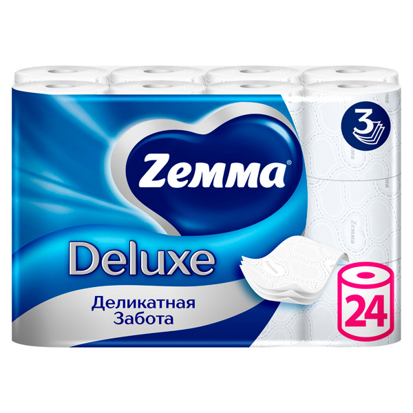 Туалетная бумага Zemma Deluxe белая 3х-слойная (24шт.) купить с бесплатной доставкой по Москве и МО. Заказать на дом или в офис можно через сайт, мобильное приложение Vodovoz.ru или по телефону. Принимаем заказы 24/7. Доставка осуществляется в удобное для Вас время.
