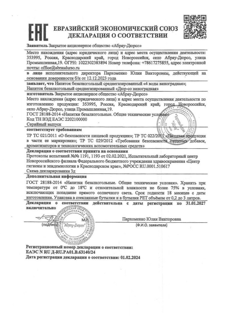 Вода из коллекции «4 воды Абрау-Дюрсо» - это вода первой категории качества добывается в предгорье Северного Кавказа из источника, расположенного неподалёку от черноморской бухты Дюрсо. Артезианская вода богата магнием, кальцием и натрием, обладает повышенной мягкостью и приятной свежестью. Лёгкий ненавязчивый вкус шампанского позволит с изыском утолить жажду даже тем, кому противопоказано употребление алкогольных напитков.