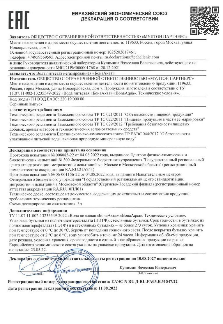 Питьевая вода «БонаАква» мягкая и приятная на вкус. Воду добывают из глубокой артезианской скважины. Химический состав уникален сбалансированным соотношением полезных микроэлементов. Минеральная вода, в составе которой преобладают кальций и магний, оказывает благоприятное действие на организм при постоянном её употреблении.