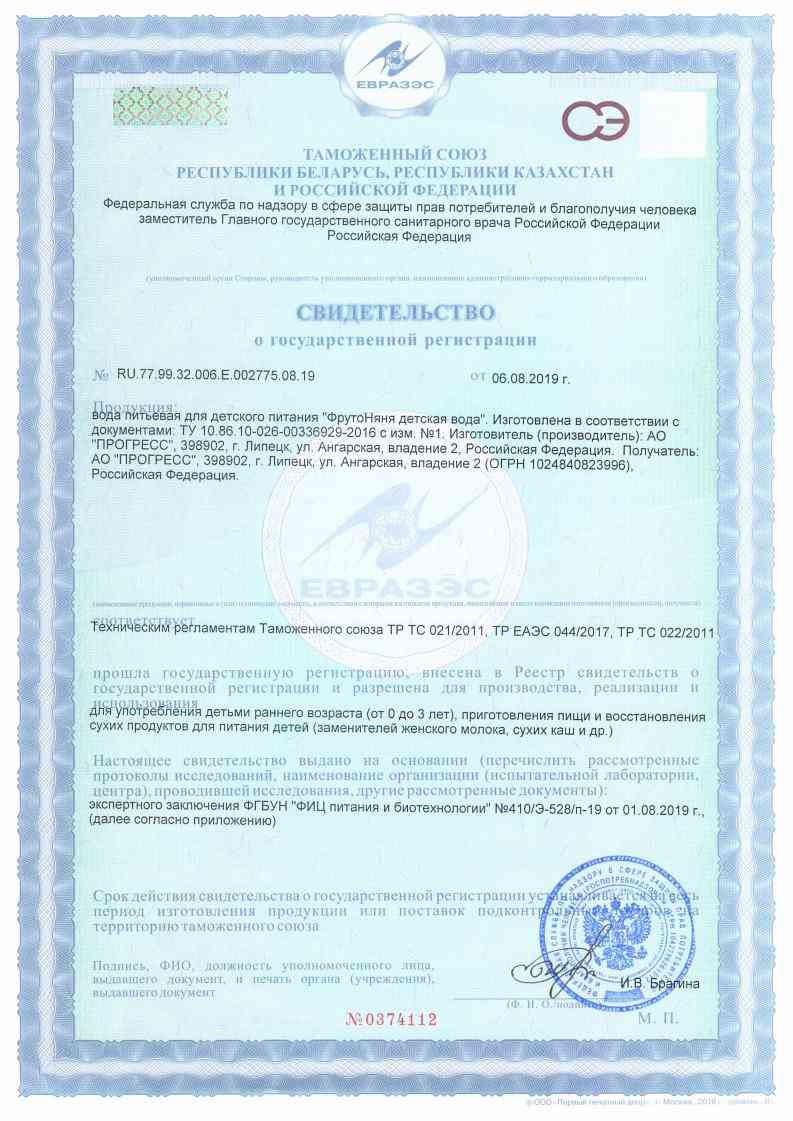 Детская вода «ФрутоНяня» - это гарантия качества. Сбалансированная минерализация позволяет сохранить оптимальный состав молочных смесей и каш при их разведении, а также обеспечить организм ребёнка необходимыми минералами, исключая осмотическую нагрузку на почки.