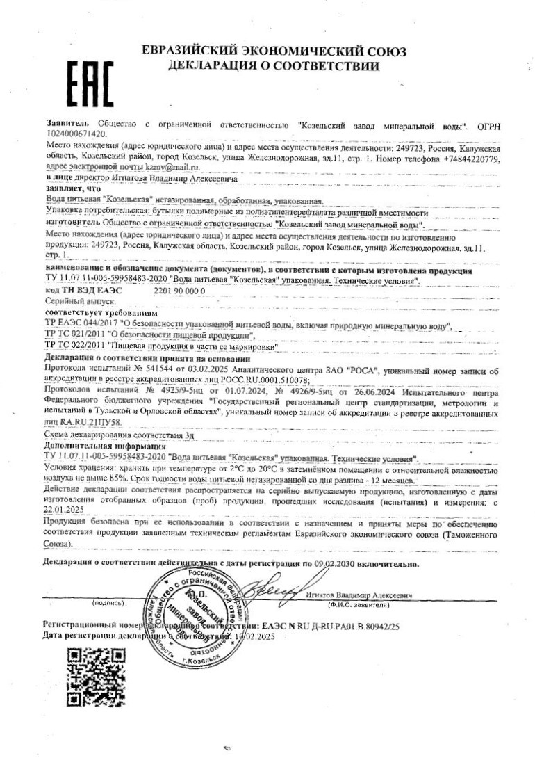 Вода "Козельская" природная артезианская питьевая первой категории. Вода прошла процесс очистки с помощью метода обратного осмоса. Общая минерализация не превышает 1 г/л. Общая жесткость воды не превышает 7,0 мг-экв/л. Производство расположено в черте города Козельска, имеющего давние исторические корни, в двух километрах от одного из духовных центров православия – монастыря Оптина пустынь.