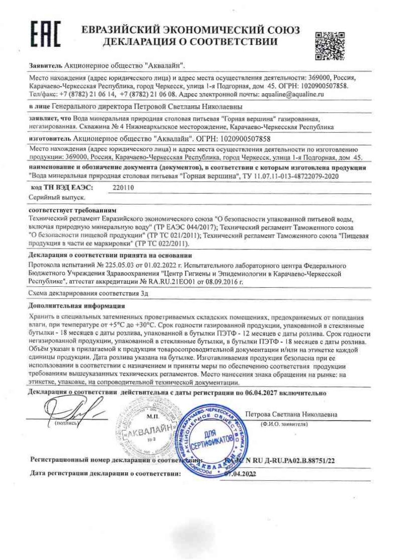 По результатам лабораторных исследований, минеральная вода «Горная вершина» прошла проверку на соответствие требованиям качества и безопасности пищевой продукции.