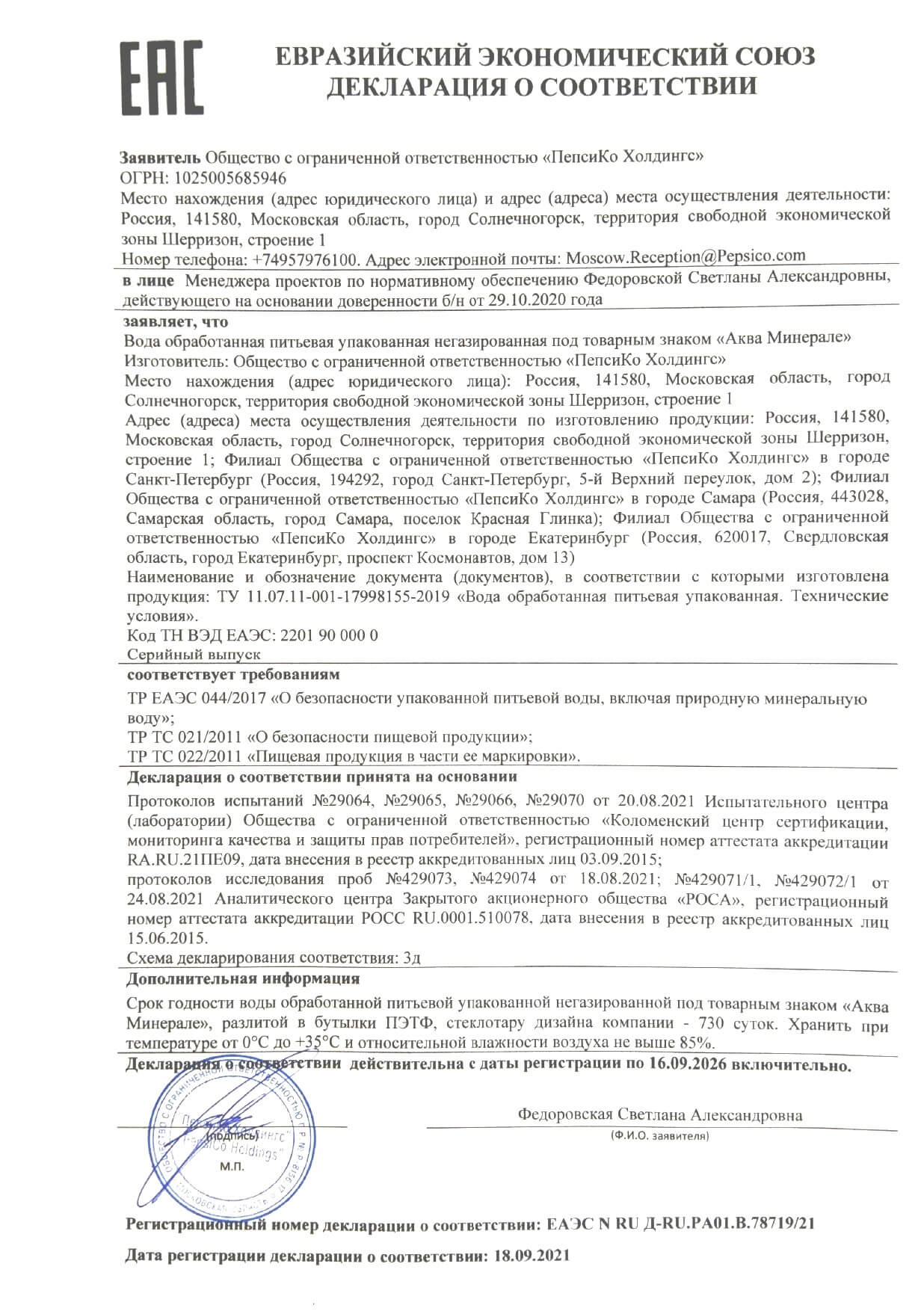 Для производства питьевой воды Аква Минерале используют артезианскую воду, поднятую на поверхность с глубинных и максимально защищенных самой природой пластов земли. Глубина скважины – от 70 до 300 метров. В процессе производства исходная артезианская вода фильтруется на многослойных песочных фильтрах, проходит очистку на современных установках обратного осмоса. На финальной стадии обработки подготовленная к розливу вода проходит многоступенчатую фильтрацию на полировочных фильтрах, чем достигается абсолютное (99,999%) удаление частиц диаметром от 1 и более микрон. Отфильтрованная таким образом вода пропускается через установку ультрафиолетового обеззараживания, затем насыщается озоном и только потом передается на розлив, где в высокосанитарных условиях происходит закупоривание бутылок с готовой продукцией. Необходимо отметить, что наполнение бутылок водой Аква Минерале проводится в среде азота. Что обеспечивает сохранение уникальных вкусовых и физико–химических свойств готовой продукции в течение двух и более лет.