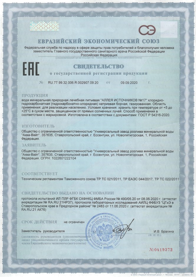 ООО "УНИВЕРСАЛЬНЫЙ ЗАВОД РОЗЛИВА МИНЕРАЛЬНОЙ ВОДЫ «АКВА-ВАЙТ» |