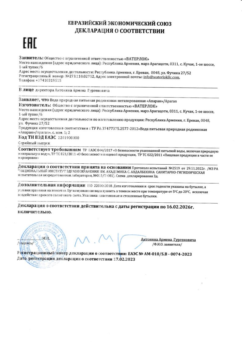Качество воды подтверждается заключениями ведущих сертификационных органов Европы и США. В нашей стране вода «Aparan» сертифицирована Федеральной Службой по Надзору в Сфере Защиты Прав Потребителя и Благополучия Человека.